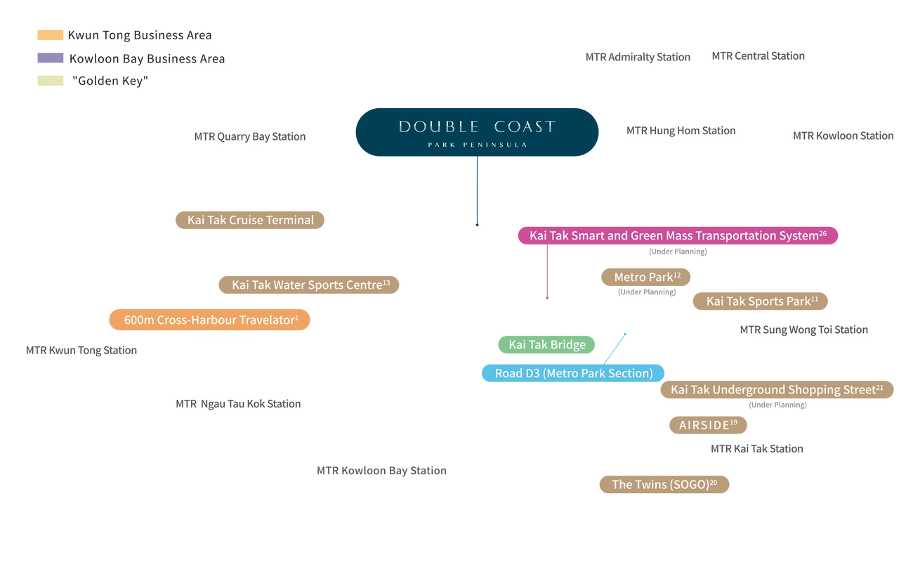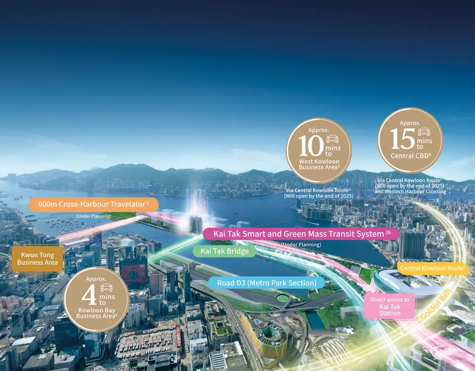 26. The information relating to the “Smart and Green Mass Transit System in Kai Tak” is for reference only. Its content may change from time to time. The implementation of such proposal and the details if implemented shall be subject to the final announcement by the relevant Government departments or organizations, which may be different from as mentioned in this advertisement. The Vendor does not make any express or implied offer, warranty, representation or undertaking in this respect. Sources of Information: The Chief Executive's 2024 Policy Address https://www.policyaddress.gov.hk/2024/en/p183.html (Reference date: 13 November 2024); Document No.1/2024 of Traffic and Transport Committee under Kowloon City District Council https://www.districtcouncils.gov.hk/kc/doc/2024_2027/tc/committee_meetings_doc/TTC/25960/1.pdf (Chinese only) (Reference date: 26 March 2024); Legislative Council Panel on Transport Subcommittee on Matters Relating to Railways: https://www.legco.gov.hk/yr2024/english/panels/tp/tp_rsc/papers/tp_rsc20241004cb3-683-2-e.pdf (Reference date: 13 November 2024); Press release of Transport and Logistics Bureau https://www.tlb.gov.hk/tc/psp/pressreleases/transport/2025/20251031a.html (Reference date: 17 November 2025)